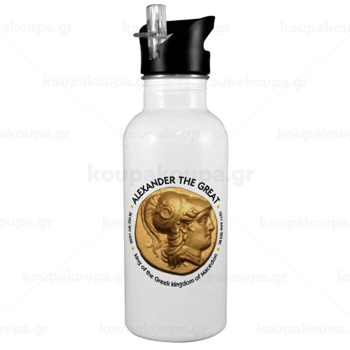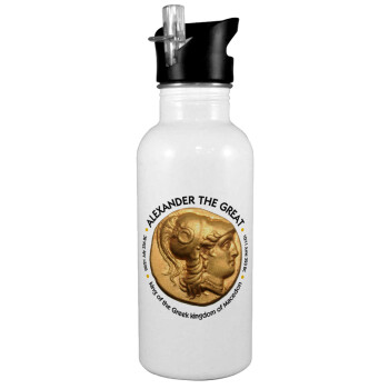 Alexander the Great, White water bottle with straw, stainless steel 600ml