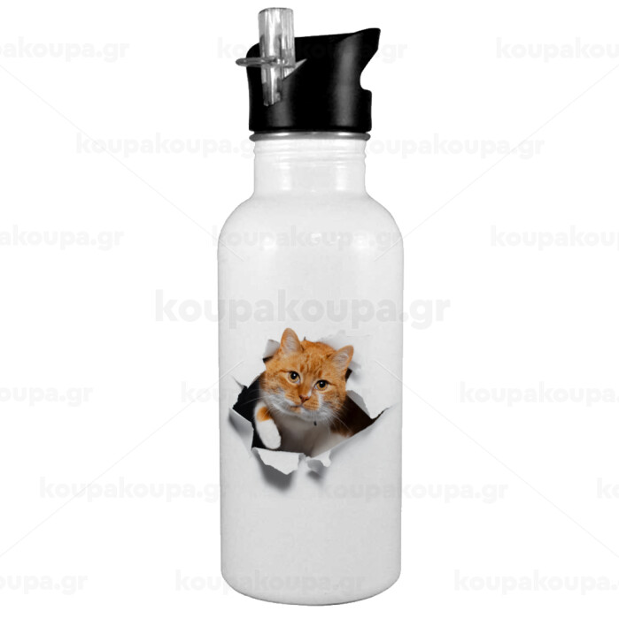 Cat cracked, White water bottle with straw, stainless steel 600ml