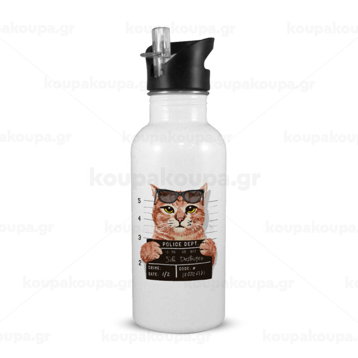 Cool cat, White water bottle with straw, stainless steel 600ml