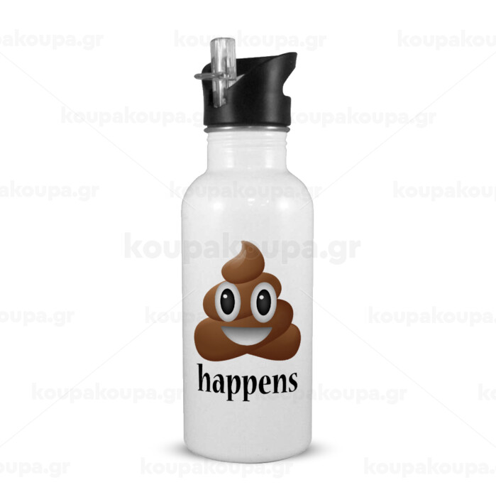 Shit Happens, White water bottle with straw, stainless steel 600ml