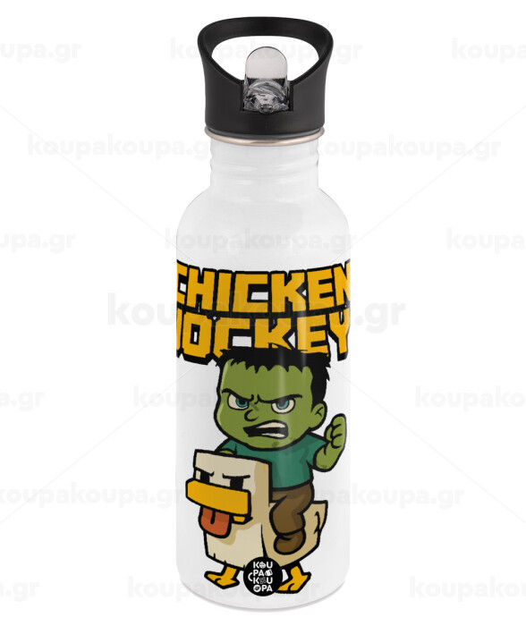 Chicken Jockey, White water bottle with straw, stainless steel 600ml