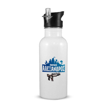 Fortnite with gun με το όνομα σου, White water bottle with straw, stainless steel 600ml