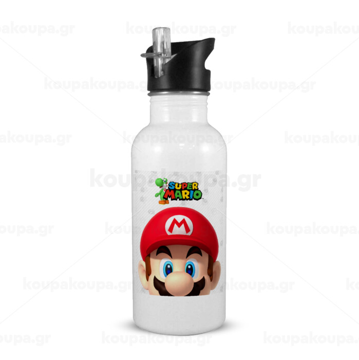 Super mario, White water bottle with straw, stainless steel 600ml
