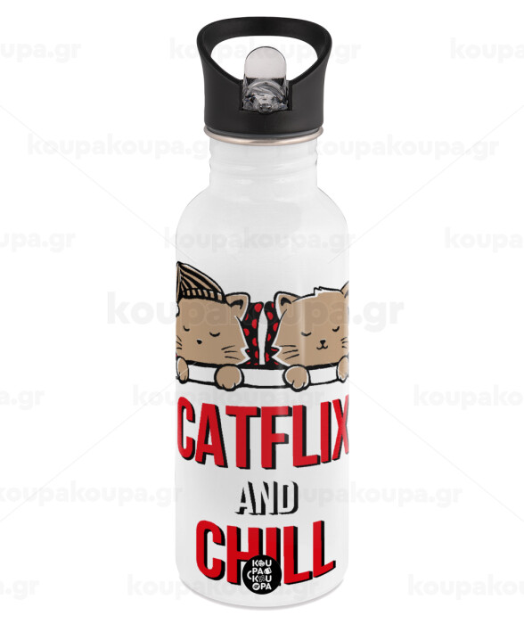 Catflix and Chill, White water bottle with straw, stainless steel 600ml