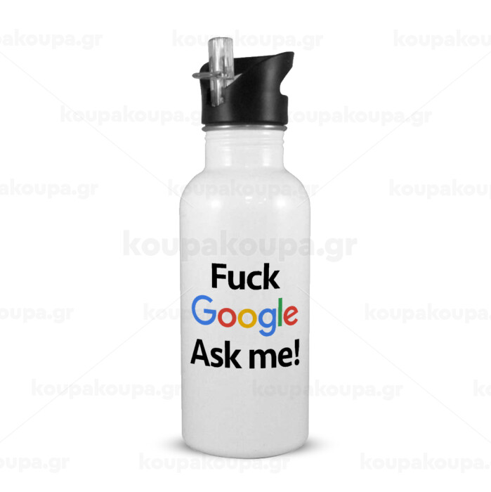 Fuck Google, Ask me!, White water bottle with straw, stainless steel 600ml