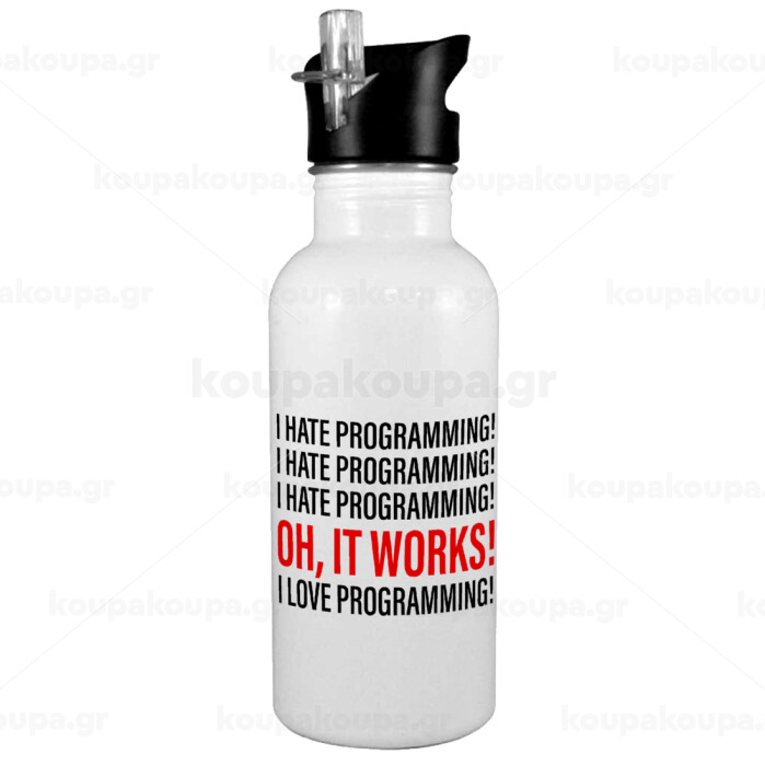 I hate programming!!!, White water bottle with straw, stainless steel 600ml
