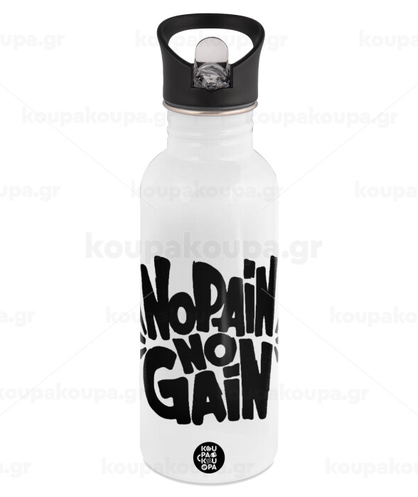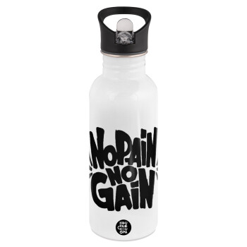 No pain no gain, White water bottle with straw, stainless steel 600ml