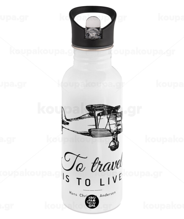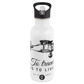 To travel is to live, White water bottle with straw, stainless steel 600ml