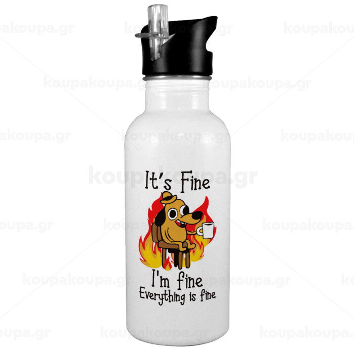 It's Fine I'm Fine Everything Is Fine, White water bottle with straw, stainless steel 600ml