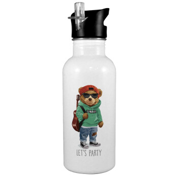 Let's Party Bear, White water bottle with straw, stainless steel 600ml