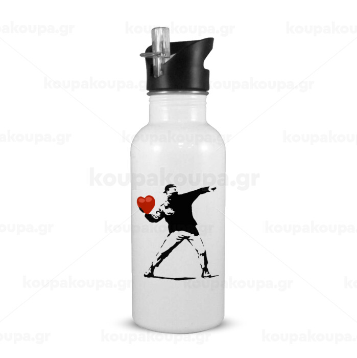 Banksy (The heart thrower), White water bottle with straw, stainless steel 600ml