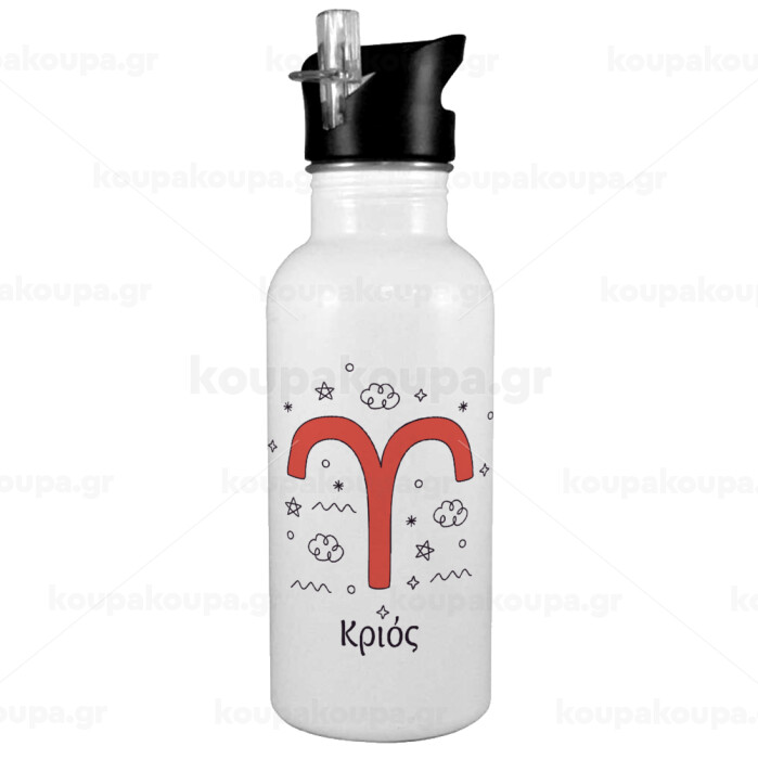 Ζώδια Κριός, White water bottle with straw, stainless steel 600ml
