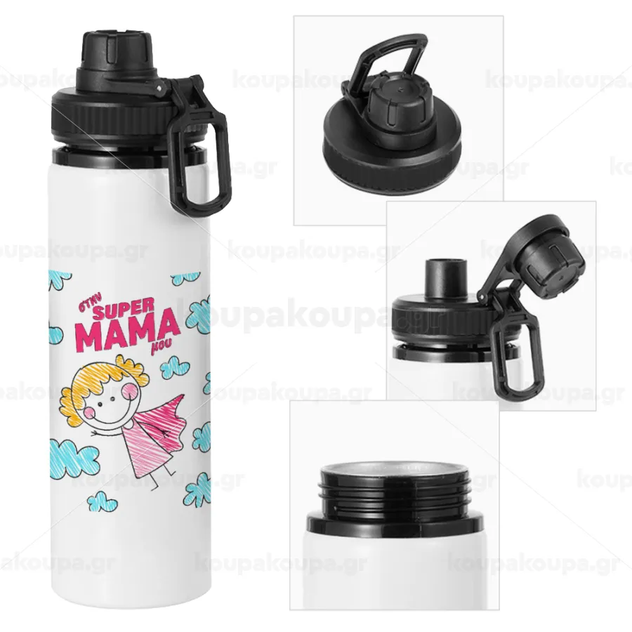 Στην SUPER μαμά μου, comic, Metal water bottle with safety cap, aluminum 850ml
