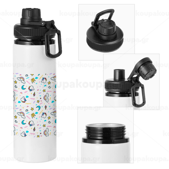 Unicorn pattern white, Metal water bottle with safety cap, aluminum 850ml