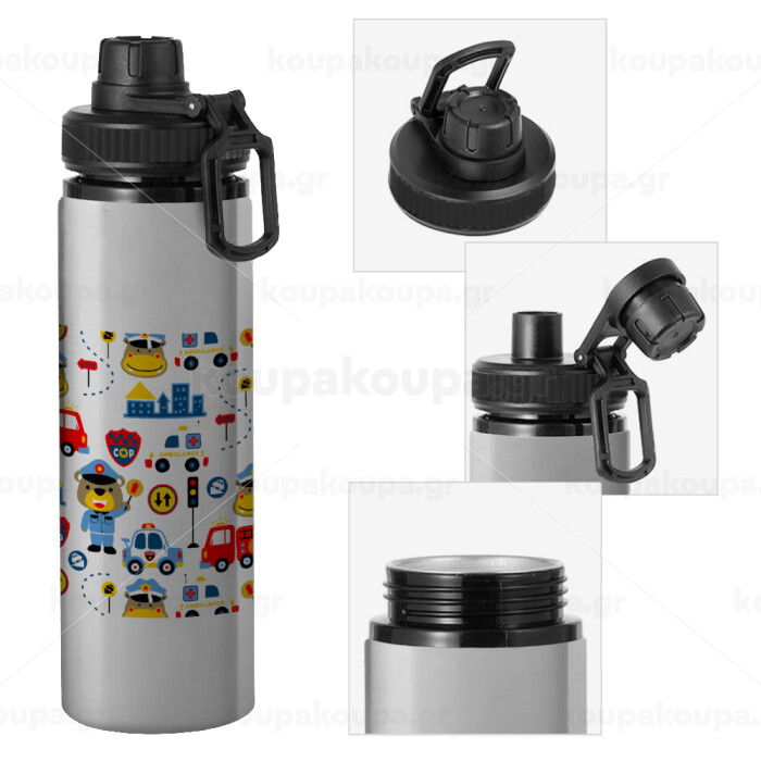 Rescue team cartoon, Metallic water bottle with safety cap, 850ml aluminum