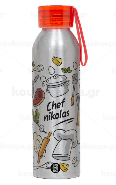 Chef με όνομα, Aluminum Sports Bottle 650ml – Silver with Red Cap and Silicone Strap
