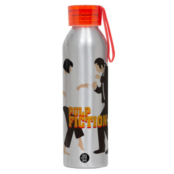 Pulp Fiction dancing, Aluminum Sports Bottle 650ml – Silver with Red Cap and Silicone Strap