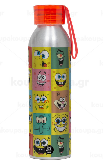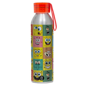 BOB spongebob and friends, Aluminum Sports Bottle 650ml – Silver with Red Cap and Silicone Strap