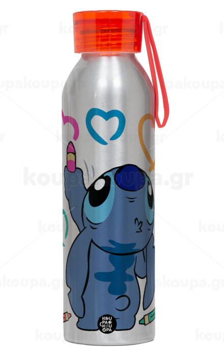 Lilo & Stitch painting, Aluminum Sports Bottle 650ml – Silver with Red Cap and Silicone Strap