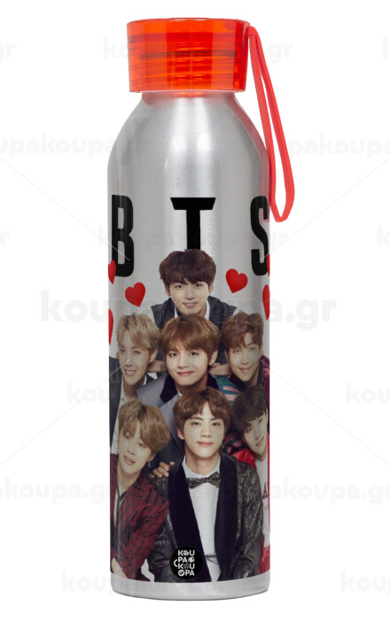 BTS hearts, Aluminum Sports Bottle 650ml – Silver with Red Cap and Silicone Strap
