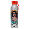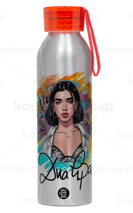 Dua lipa, Aluminum Sports Bottle 650ml – Silver with Red Cap and Silicone Strap