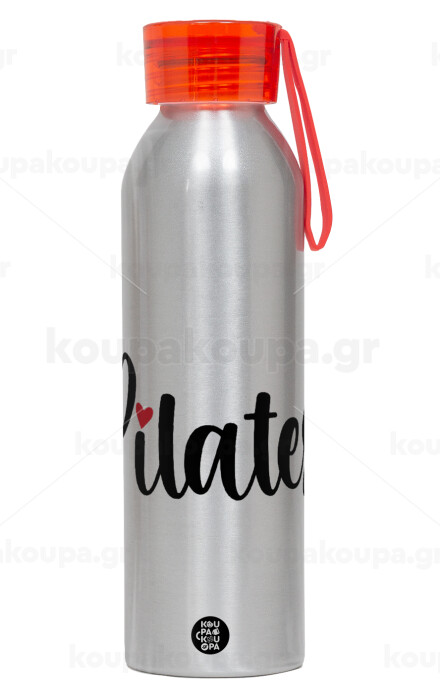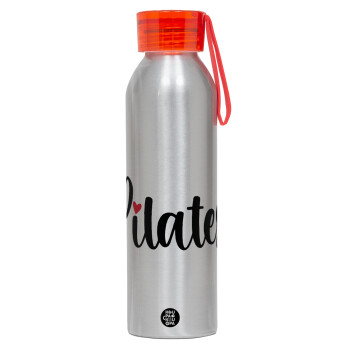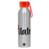 Pilates love, Aluminum Sports Bottle 650ml – Silver with Red Cap and Silicone Strap