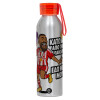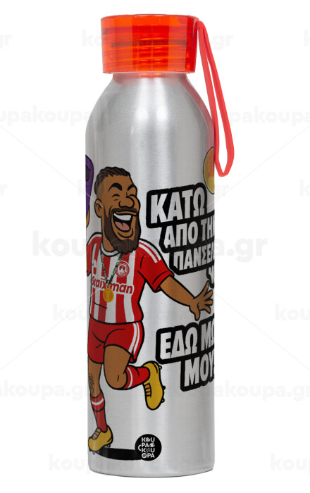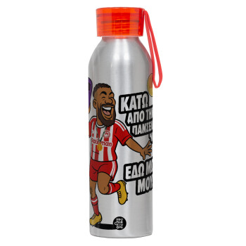 Ροντινέι, "ΚΑΤΩ ΑΠΟ ΤΗΝ ΠΑΝΣΕΛΗΝΟ ΜΟΥ!", Aluminum Sports Bottle 650ml – Silver with Red Cap and Silicone Strap