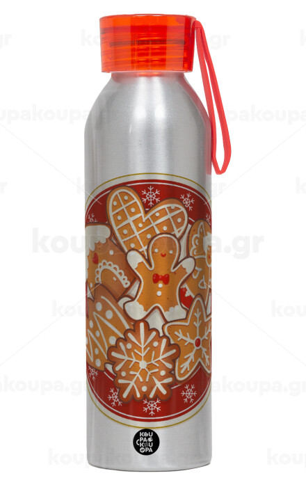 xmas cookies, Aluminum Sports Bottle 650ml – Silver with Red Cap and Silicone Strap