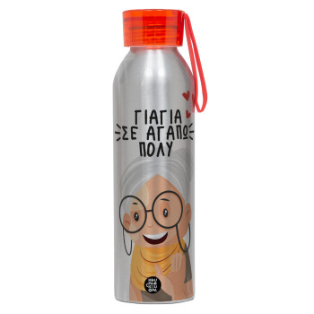 Γιαγιά σε αγαπώ πολύ!, Aluminum Sports Bottle 650ml – Silver with Red Cap and Silicone Strap
