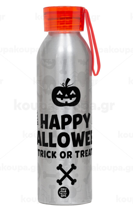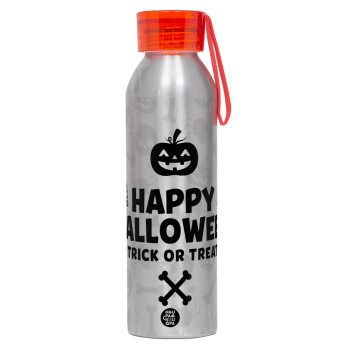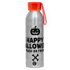 Happy Halloween pumpkin, Aluminum Sports Bottle 650ml – Silver with Red Cap and Silicone Strap