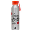 Happy Valentines Day!!!, Aluminum Sports Bottle 650ml – Silver with Red Cap and Silicone Strap