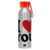 I LOVE YOU, Aluminum Sports Bottle 650ml – Silver with Red Cap and Silicone Strap