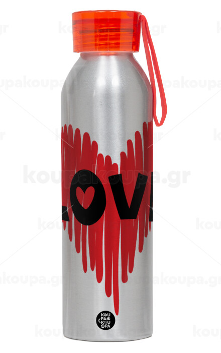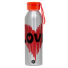 I Love You red heart, Aluminum Sports Bottle 650ml – Silver with Red Cap and Silicone Strap