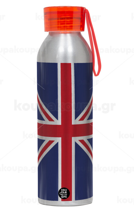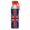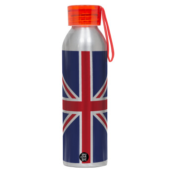 UK Flag, Aluminum Sports Bottle 650ml – Silver with Red Cap and Silicone Strap