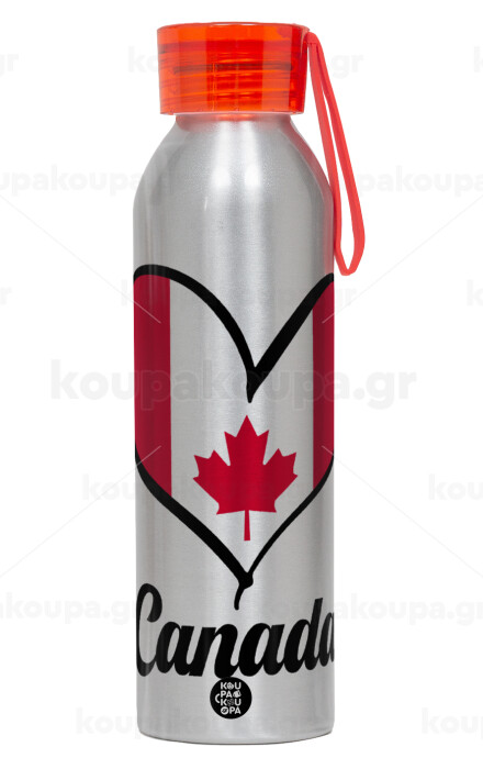 Canada flag, Aluminum Sports Bottle 650ml – Silver with Red Cap and Silicone Strap