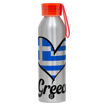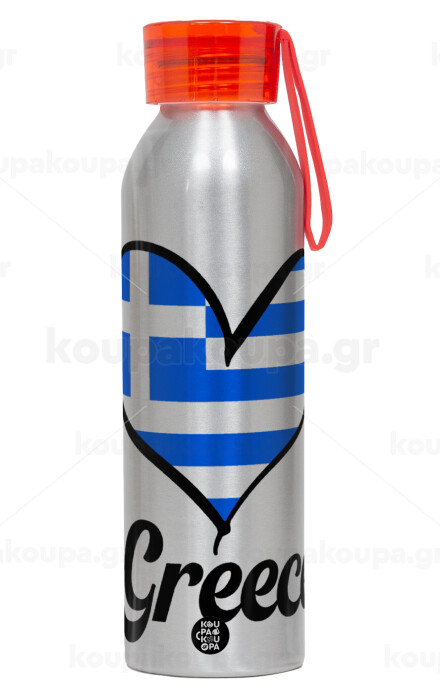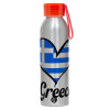 Greece flag, Aluminum Sports Bottle 650ml – Silver with Red Cap and Silicone Strap