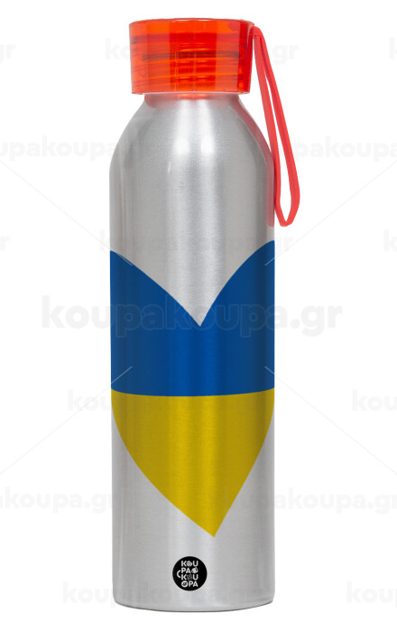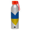 UKRAINE heart, Aluminum Sports Bottle 650ml – Silver with Red Cap and Silicone Strap