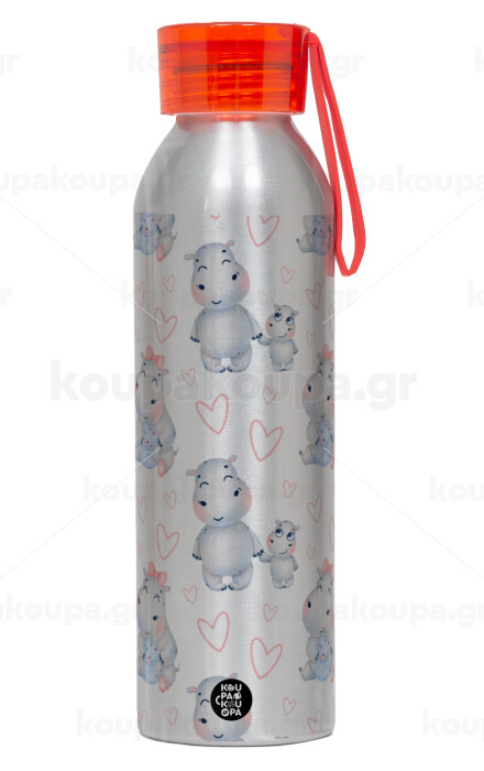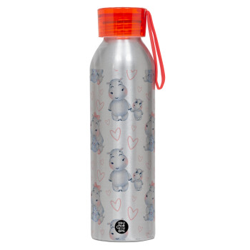 Hippo, Aluminum Sports Bottle 650ml – Silver with Red Cap and Silicone Strap