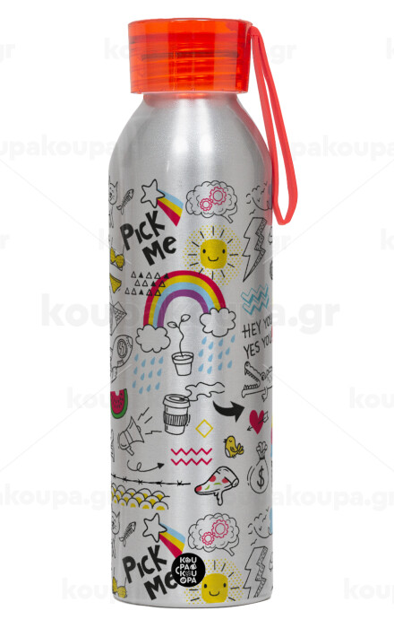 Doodle kids, Aluminum Sports Bottle 650ml – Silver with Red Cap and Silicone Strap