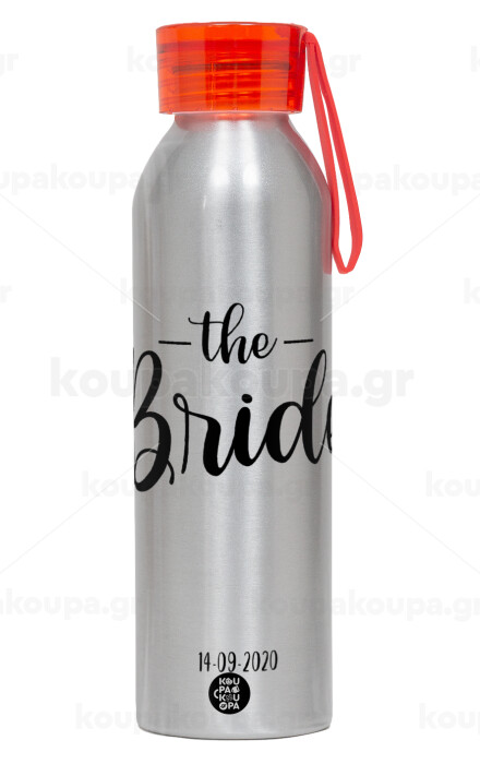 Groom & Bride (Bride), Aluminum Sports Bottle 650ml – Silver with Red Cap and Silicone Strap