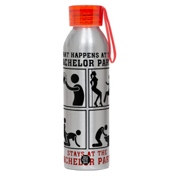 What happens at the bachelor party, stays at the bachelor party!, Aluminum Sports Bottle 650ml – Silver with Red Cap and Silicone Strap