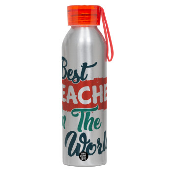 Best teacher in the World!, Aluminum Sports Bottle 650ml – Silver with Red Cap and Silicone Strap
