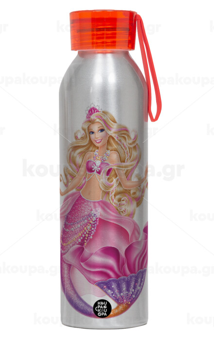 Barbie mermaid , Aluminum Sports Bottle 650ml – Silver with Red Cap and Silicone Strap
