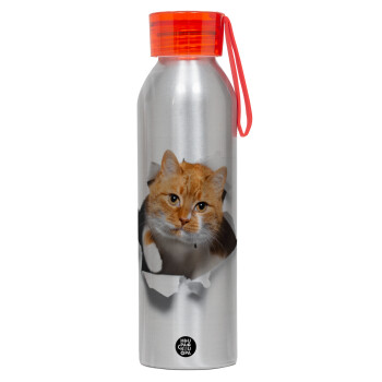 Cat cracked, Aluminum Sports Bottle 650ml – Silver with Red Cap and Silicone Strap