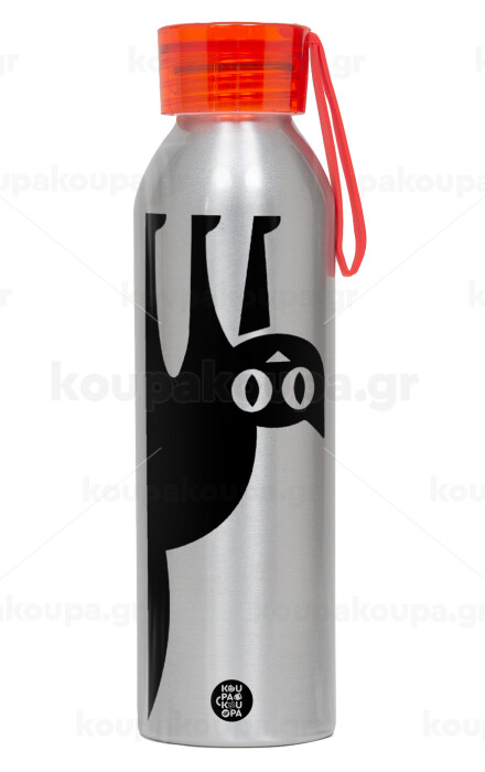 Cat upside down, Aluminum Sports Bottle 650ml – Silver with Red Cap and Silicone Strap