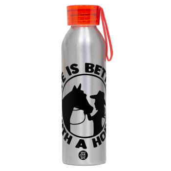 Life is Better with a Horse, Aluminum Sports Bottle 650ml – Silver with Red Cap and Silicone Strap