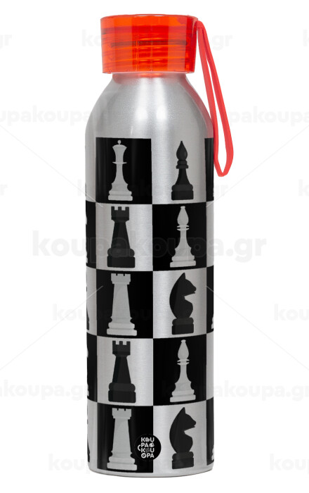 Chess set, Aluminum Sports Bottle 650ml – Silver with Red Cap and Silicone Strap