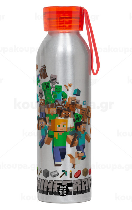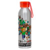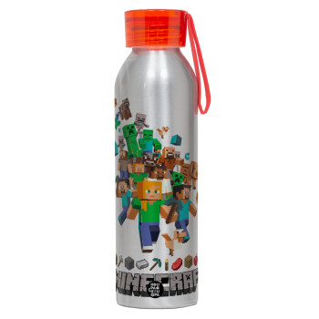Minecraft adventure, Aluminum Sports Bottle 650ml – Silver with Red Cap and Silicone Strap
