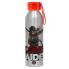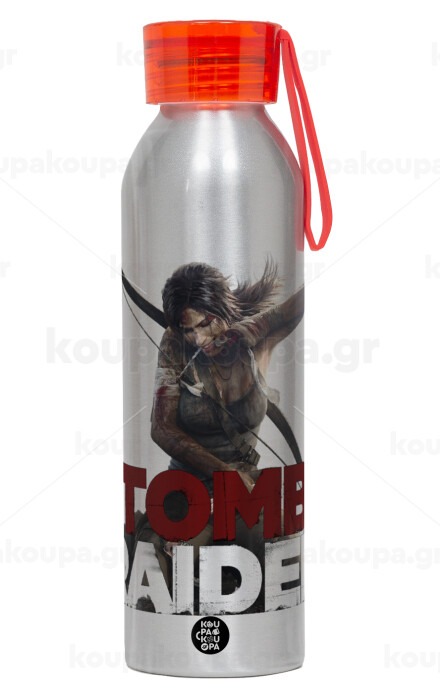 Tomb raider, Aluminum Sports Bottle 650ml – Silver with Red Cap and Silicone Strap