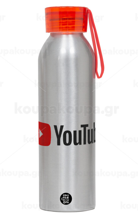Youtube, Aluminum Sports Bottle 650ml – Silver with Red Cap and Silicone Strap